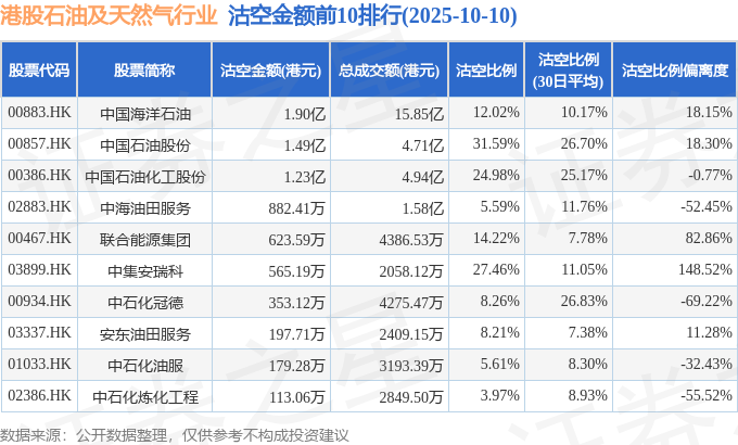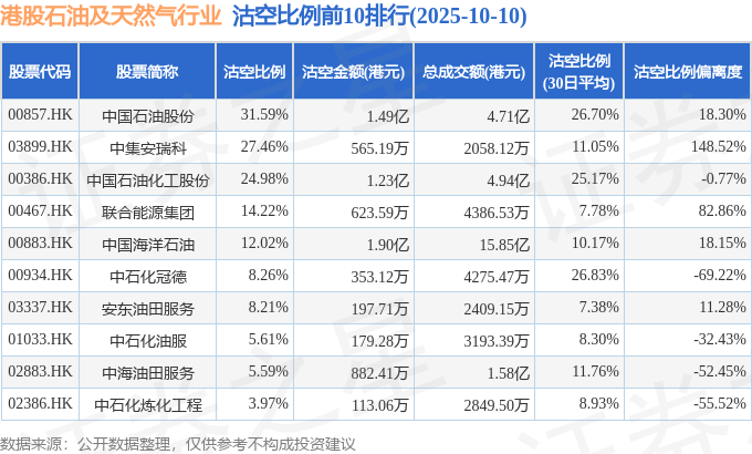 从沽空比例来看,中国石油股份、中集安瑞科、中国石油化工股份沽空比例位居行业前三,分别为31.59%、27.46%、24.98%。