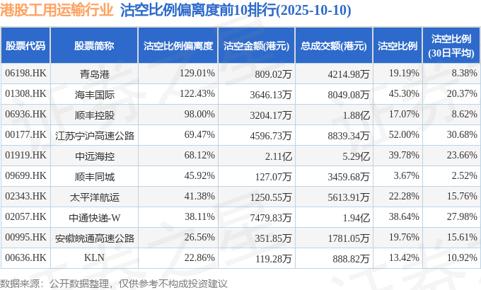 从沽空比例偏离度来看,青岛港、海丰国际、顺丰控股沽空比例偏离度位居行业前三,分别为129.01%、122.43%、98%。