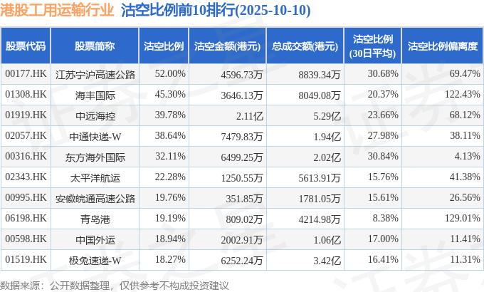 从沽空比例来看,江苏宁沪高速公路、海丰国际、中远海控沽空比例位居行业前三,分别为52%、45.3%、39.78%。