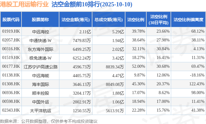 从沽空金额来看,中远海控、中通快递-W、东方海外国际沽空金额位居行业前三,分别为2.11亿港元、7479.83万港元、6499.25万港元。
