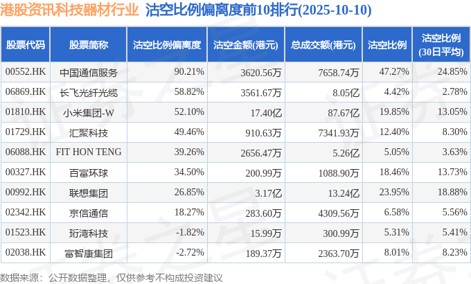 从沽空比例偏离度来看,中国通信服务、长飞光纤光缆、小米集团-W沽空比例偏离度位居行业前三,分别为90.21%、58.82%、52.1%。