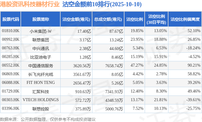 从沽空金额来看,小米集团-W、联想集团、中兴通讯沽空金额位居行业前三,分别为17.4亿港元、3.17亿港元、2.38亿港元。