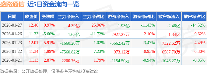 证券之星消息,盛路通信1月27日涨停收盘,收盘价12.46元。该股于13点11分涨停,未打开涨停,截止收盘封单资金为1.33亿元,占其流通市值1.26%。