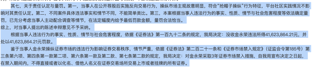 对于发帖行为性质,浙江证监局明确,金永荣存在反复发帖、转发荐股内容以强化推荐逻辑的行为,部分帖文还通过展示交易感受、仓位记录等方式,向外界传递自身已加仓买入或未卖出股票的信号,足以对投资者产生引导跟随交易影响。