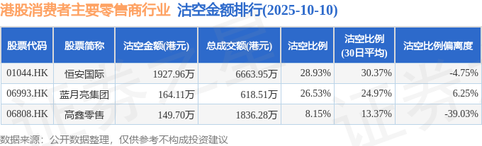 由于港股人民币柜台交易股票成交金额较小,沽空比例普遍偏高,为了避免干扰,已将人民币柜台交易股票从排行表格中剔除。
