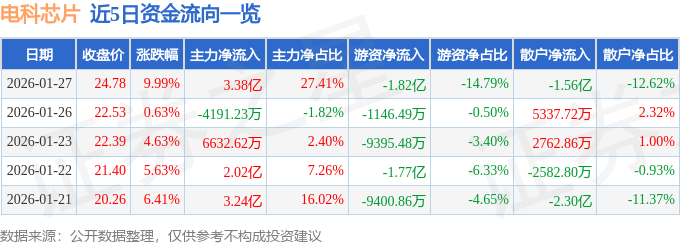 1月27日的资金流向数据方面,主力资金净流入3.38亿元,占总成交额27.41%,游资资金净流出1.82亿元,占总成交额14.79%,散户资金净流出1.56亿元,占总成交额12.62%。