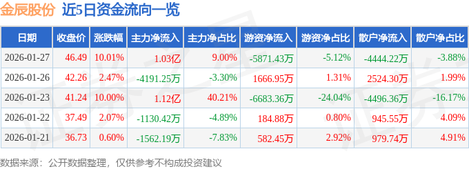 1月27日的资金流向数据方面,主力资金净流入1.03亿元,占总成交额9.0%,游资资金净流出5871.43万元,占总成交额5.12%,散户资金净流出4444.22万元,占总成交额3.88%。