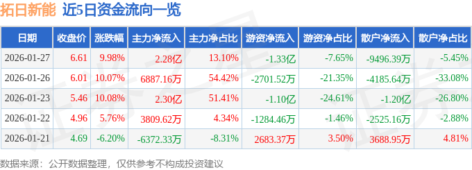 证券之星消息,拓日新能1月27日涨停收盘,收盘价6.61元。该股于9点31分涨停,2次打开涨停,截止收盘封单资金为1.71亿元,占其流通市值1.86%。