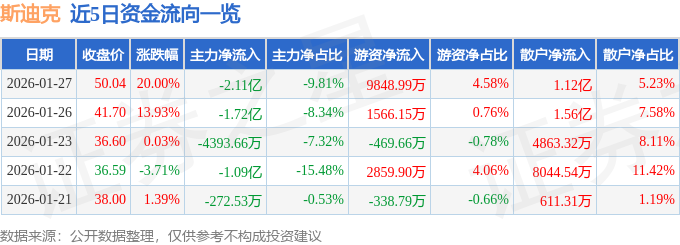 证券之星消息,斯迪克1月27日涨停收盘,收盘价50.04元。该股于11点28分涨停,未打开涨停,截止收盘封单资金为1.38亿元,占其流通市值0.87%。