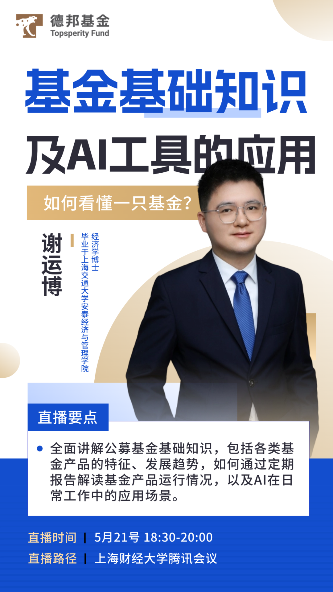 5月21日,德邦基金谢老师走进上海财经大学的云端课堂,带来了《基金基础知识——如何看懂一只基金及AI工具在工作中的应用》主题课程。课程围绕“如何看懂一只基金”展开,系统讲解了基金的定义、分类、运作方式及费用结构,并结合实际案例,详细讲解如何解读基金定期报告、评估基金净值表现的实用方法,切实提升同学们遴选基金、洞察信息的实战能力,为未来的理财规划筑牢根基。