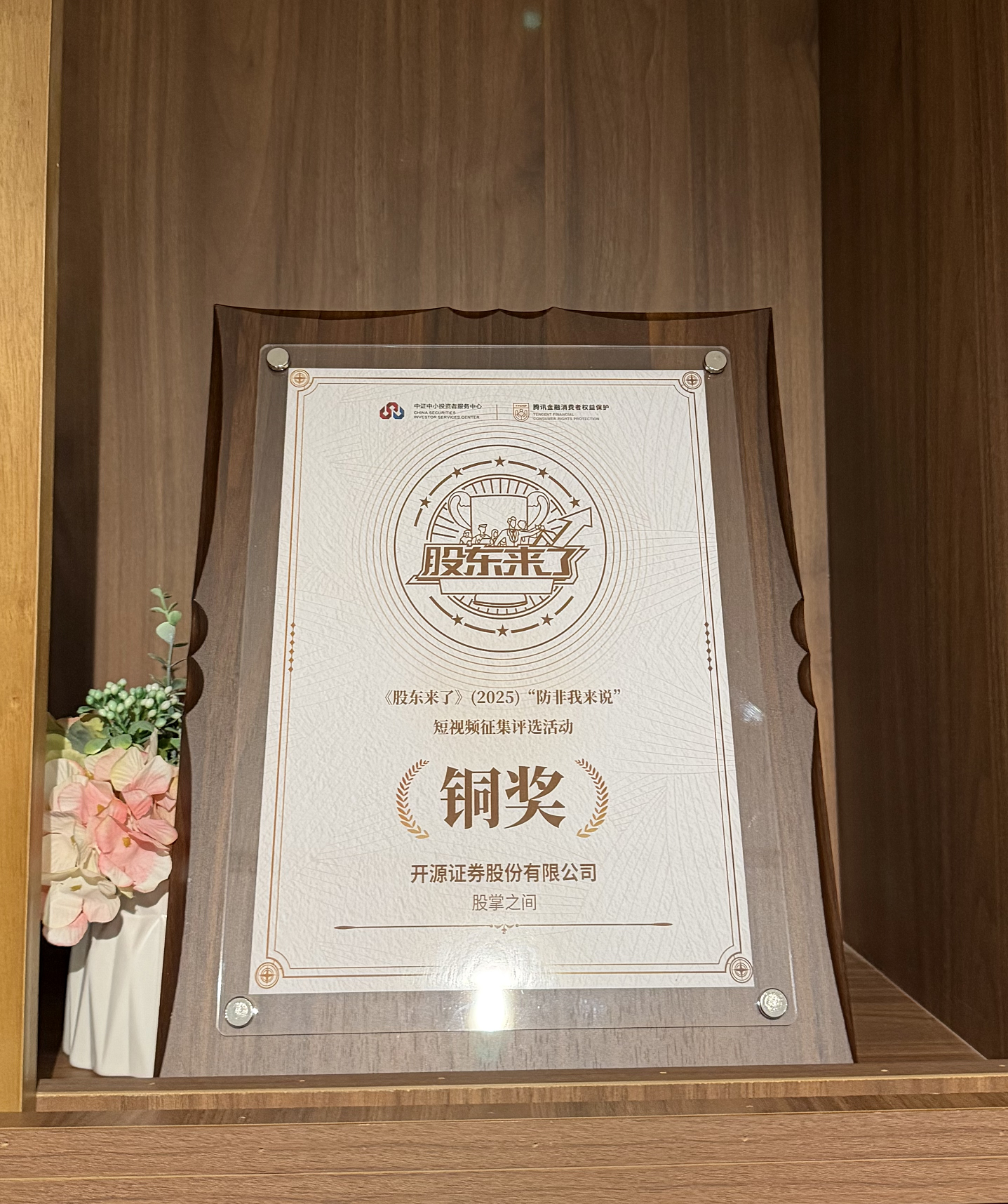 近日,由中证中小投资者服务中心联合上海、浙江、湖南、广东、云南五地证监局,携手腾讯集团(金融消费者权益保护部)共同举办的《股东来了》(2025)“防非我来说”短视频征集评选活动结果正式揭晓。开源证券选送的作品《股掌之间》,凭借专业的内容呈现与创新的视觉形式,在全国535家单位投稿的作品中脱颖而出,经主办方初步筛选,作为57部优选作品之一进入展播、公众投票和专业评审环节并最终荣获铜奖,为公司投资者教育工作再添新彩。