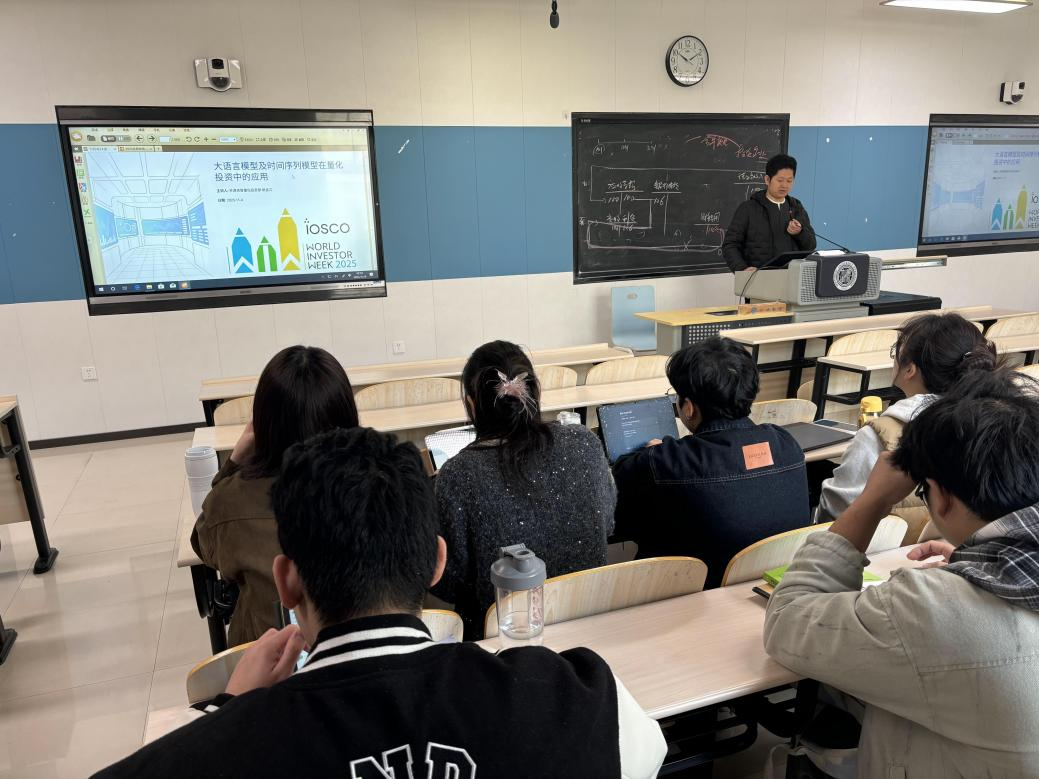 姚金江通过介绍量化投资的三个不同历史阶段的发展历程,到当前AI驱动的策略革新,让学生清晰把握技术迭代与市场变革的联动逻辑,结合世界投资者周“人工智能”主题,对比大语言及时间序列两类模型的实用价值,通过对研报、新闻等非结构化数据的语义解析,模型可在30分钟内完成传统分析师4小时的研究分析工作,同时围绕“防范欺诈”主题,提醒同学们不要只套用历史数据,需要持续通过测试市场交易中的价格变动,来验证模型的正确性与稳定性。学习路径环节,姚金江建议同学们夯实理论基础,学习经典案例,鼓励同学们积极参加各类量化投资竞赛,以赛促学提升综合能力。