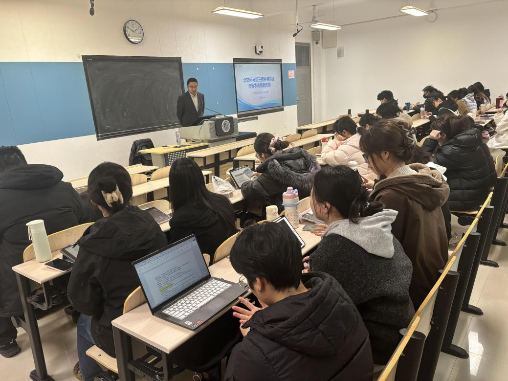 高晓东系统梳理了我国资本市场体系架构及功能定位,结合北交所新三板新增挂牌企业的市场动态,阐释了不同板块的差异化服务逻辑,帮助同学们建立对多层次资本市场的整体认知框架。北交所及新三板市场介绍部分重点解读2025年北交所最新上市规则修订要点,包括市值财务指标、公司治理要求等核心条款,为学生搭建规则认知的基础。在企业挂牌上市关注事项中,高晓东结合投行案例经验,聚焦合规审核要点、流程节点规范等实务痛点讲解应对建议,帮助同学们将理论知识与实务操作初步衔接。