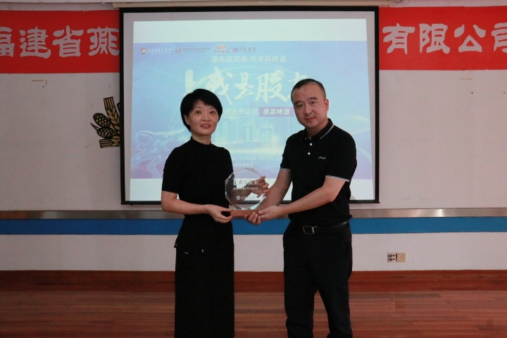参观结束后,惠泉啤酒董事会秘书程晓梅女士与投资者展开座谈。投资者围绕公司2025年上半年经营业绩表现、啤酒行业中高端化趋势应对策略等议题展开交流。座谈结束后,兴业证券为惠泉啤酒授予上交所“我是股东”活动纪念牌,活动圆满收官。