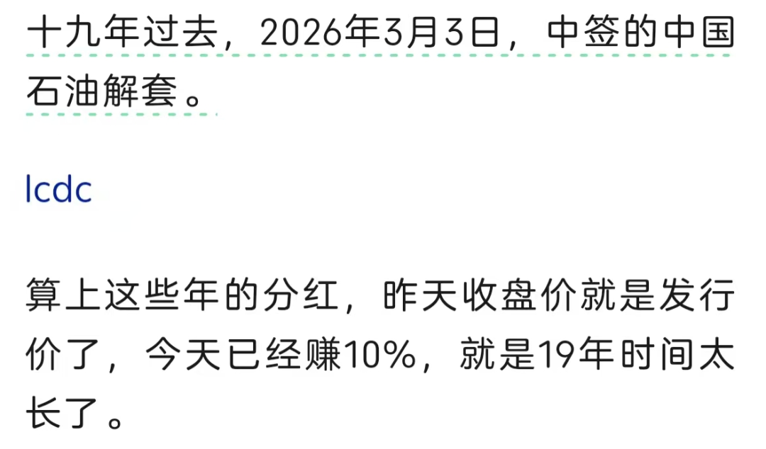 前几天看到一个帖子,有人在2007年打新中签没卖的中国石油,经过19年时间竟然解套了。
